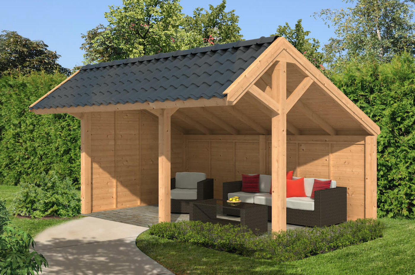 Dit buitenverblijf is aan de achterkant helemaal dicht. En aan 1 zijde is deze Lariks Douglas houten kapschuur ook helemaal afgesloten, zo zit u heerlijk beschut. De blanke wanden voor de achter- en zijwand zijn onbehandeld en opgebouwd met blanke Lariks Douglas potdeksel planken van 19.5 cm breed en 2.2 cm dik. Het regelwerk voor de opbouw van de Lariks potdekselwanden worden standaard meegleverd.